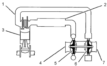 (1) 排氣岐管 (2)后冷器(3)發(fā)動(dòng)機(jī)氣缸 (4)進(jìn)氣口 (5)渦輪增壓器壓縮機(jī)葉輪(6)渦輪坩壓器堝輪葉鞋(7)排氣出口