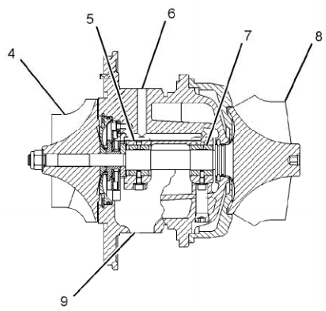 (4)壓縮機(jī)葉輪 (5)軸承 (6)機(jī)油進(jìn)口 (7)軸承 (8)渦輪機(jī)葉輪 (9)出油口