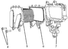1確保冷卻器基體(5)清潔、無堵塞或損壞。確保隔板(7)清潔且無損壞。更換任何損壞的部件。