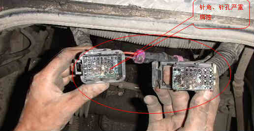 檢查水溫傳感器接插件,清除故障碼后冷卻水溫信號(hào)超高限故障不再出現(xiàn),但是用檢測(cè)儀檢測(cè)到故障碼:“256指示燈1驅(qū)動(dòng)線路故障”頻繁出現(xiàn),玉柴電噴柴油發(fā)動(dòng)機(jī)還是經(jīng)常自動(dòng)熄火,檢查玉柴電噴柴油發(fā)動(dòng)機(jī)線束,發(fā)現(xiàn)線束42接插件進(jìn)水,針腳已嚴(yán)重腐蝕,見圖5,