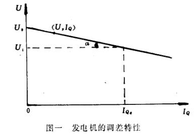 在穩定運行情況下,發電機端電壓U與該電機無功電流I Q之間的關系U=f(IQ)稱為發電機的調節特性。它可以近似用一條直線代表,如圖一所示。