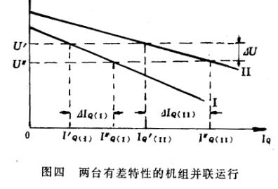Hypothesis two has a characteristic of generator parallel operation in the bus, its differential regulation characteristics are figure four center curve and curve of I II. Then, two generators of end electric is the same, equal to the bus voltage, such as U′, each motor load reactive power is determined, for example, I′ Q ( I ) and 1′ Q ( II ). Now suppose that the user needs and reactive current is increased, so the bus voltage drop, then the regulator movement, increasing the excitation current of the generator, the last bus voltage to a new steady state value U ", each machine burden of reactive current increases to the new value of I" Q ( I ) and Q ( I ″II ).