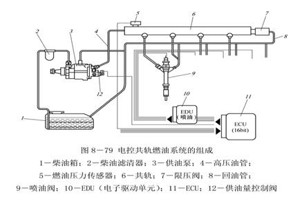 供油的特點是根據(jù)壓力一時間的變化關(guān)系來調(diào)節(jié)供油量,供油量的調(diào)節(jié)是在柴油泵中進行的,高壓柴油的產(chǎn)生和定時噴射是在噴油器中完成的。下圖為PT泵電噴燃油系統(tǒng)組成圖