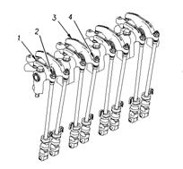 1、 進(jìn)氣門搖臂 2、調(diào)整螺釘 3、排氣門搖臂 4、調(diào)整螺釘