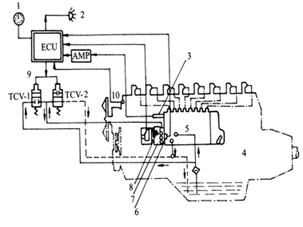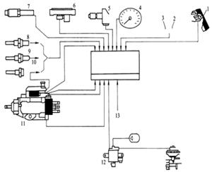 1 – 轉(zhuǎn)速表 2 – 故障指示燈 3 – 供油齒條位置傳感器 4 – 柴油機(jī) 5 – 噴油泵 6 – 正時(shí)傳感器 7 – 正時(shí)控制閥 8 – 轉(zhuǎn)速傳感器 9 – 正時(shí)控制電磁閥 10 – 冷卻液溫度傳感器