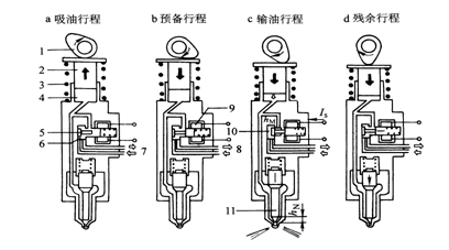 1-凸輪 2-柱塞 3-回位彈簧 4-高壓腔 5-電磁閥針閥 6-電磁閥閥腔 7-進(jìn)油通道 8-回油通道 9-線圈 10-低壓腔